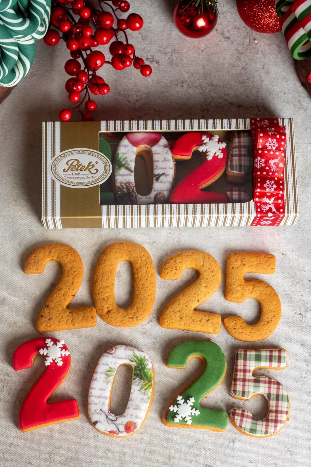 Petek Yılbaşı desenleri ile kaplanmış zencefill, tarçınlı, karanfill, tereyağlı 2025 kurabiye