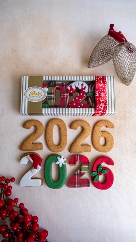 Petek Yılbaşı desenleri ile kaplanmış zencefill, tarçınlı, karanfill, tereyağlı 2026 kurabiye