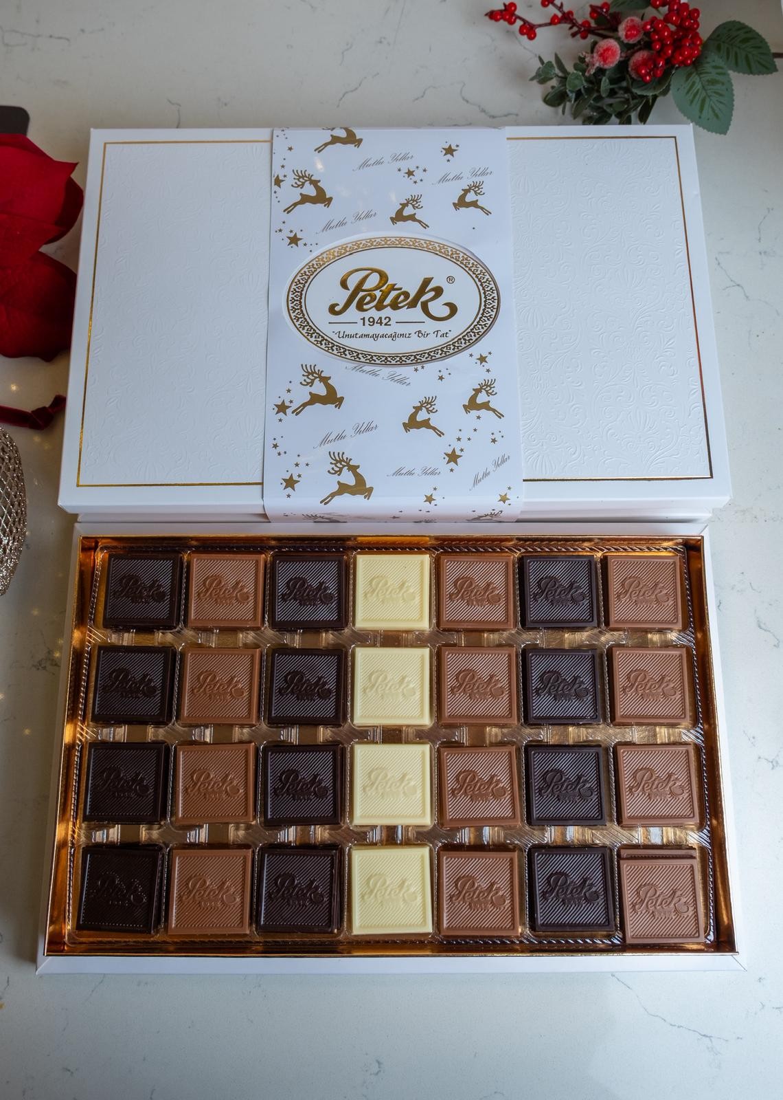 İçerik: Beyaz çikolata, Bitter çikolata, Sütlü çikolata